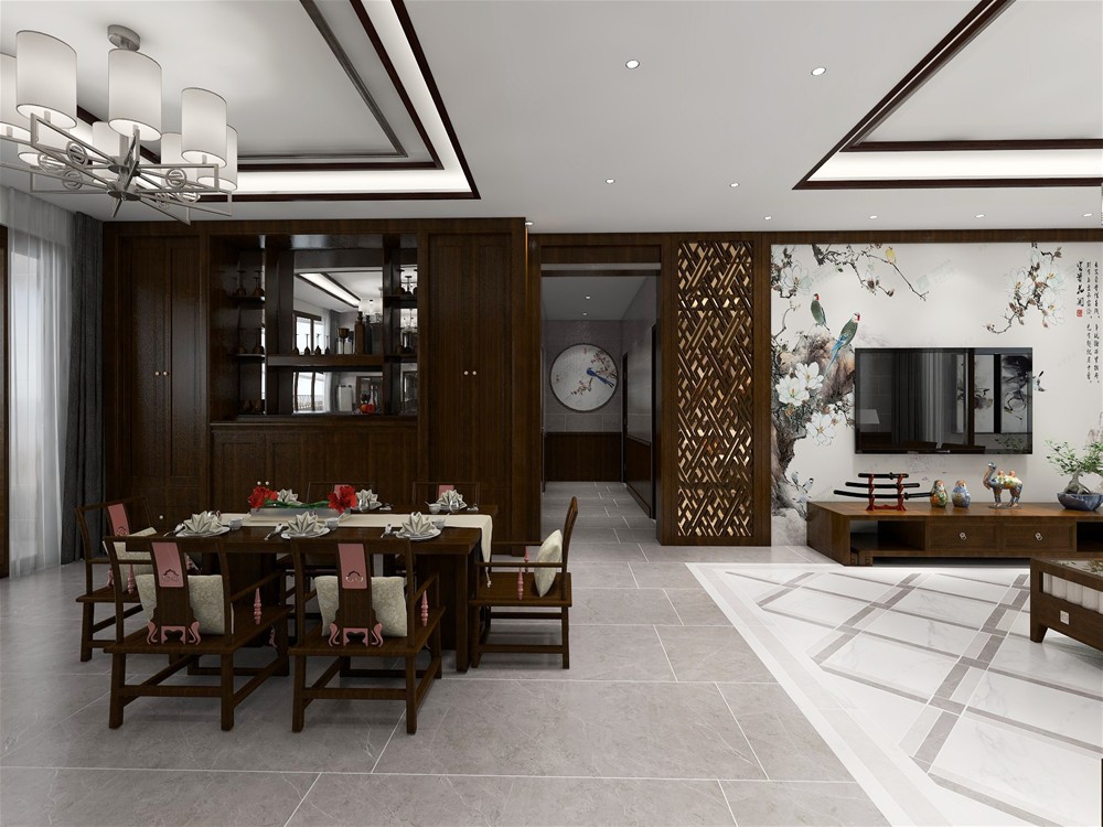 新中式之美,美在包容。實木桌椅搭配白色吊燈,兩種質感在空間中碰撞磨合,吊燈的光暈下處處流溢出歲月的含香。