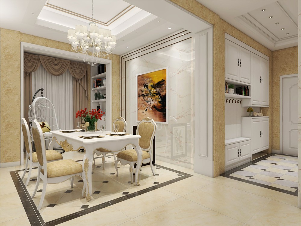 開放式的餐廳與客廳相連通,中間的走廊讓客廳、餐廳區域分明,餐廳矩形餐桌和復古的吊燈組合,天花是簡單的雕花,留住了中式韻味注入了新中式的創新元素。