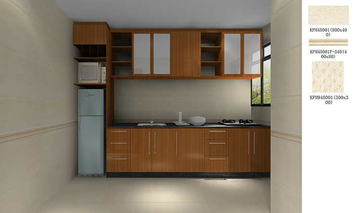 廚房:地板和墻面延續了相同色調,所以櫥柜做成了木紋色,顯得非常整潔。